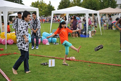 下駄飛ばしゲーム。下駄を遠くまで飛ばせたら、うれしい景品がもらえるというもの。ビーチボールがとても人気で、何度もチャレンジするお子さんの姿が見られました。