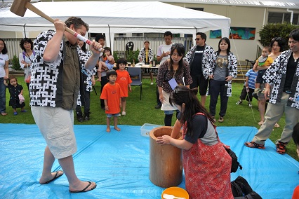 日本総領事館からおかりした杵とうすを使って、餅つきを行いました。