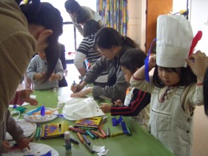 そして、さっき配った帽子をオリジナルに変身させる工作です。