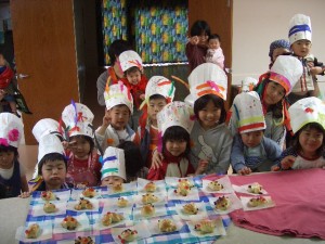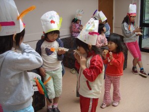 からすがかぶっているようなコック帽をいただいたので、子どもたちへ配布。