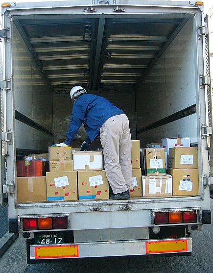 写真は、いづれも神戸港搬入のためのラベル貼りの作業中のものです。