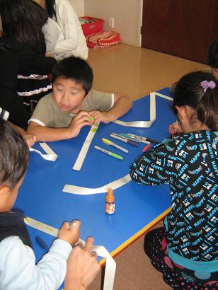 「日本一」」「ももたろう」、ももの絵をリボンに描いていきます。
