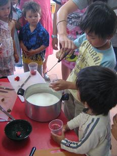 そろそろ杏仁豆腐もできたころ。ペイントでカラフルになった手を