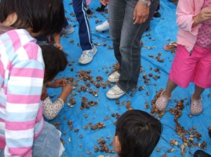 まずは持ち寄ったどんぐりをシートの上に広げて、足で踏み潰していきます。