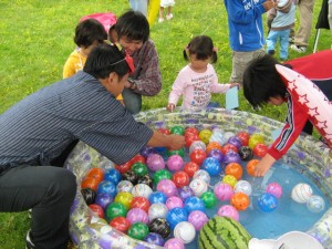 人気のヨーヨー釣りコーナー。ちょびひげ(?)の店主さん、すてきでした。