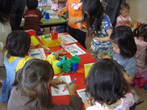 色塗りに夢中になる子ども、タイヤ作りに夢中になる子ども。