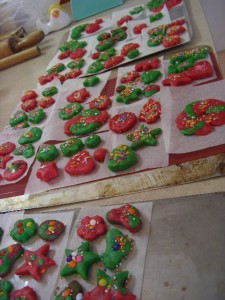 それをみんなで飾りつけ。アイシング用の砂糖を濃い目に溶いて