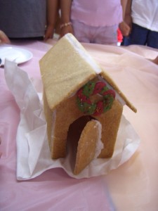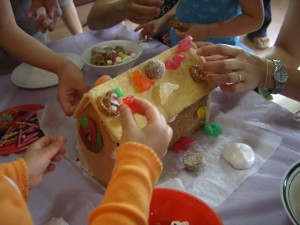 作ったばかりのお菓子の家をみんなで分けてみんなで味見。