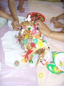子どもたちがうれしそうにもちよったお菓子を貼り付けている姿が忘れられません。